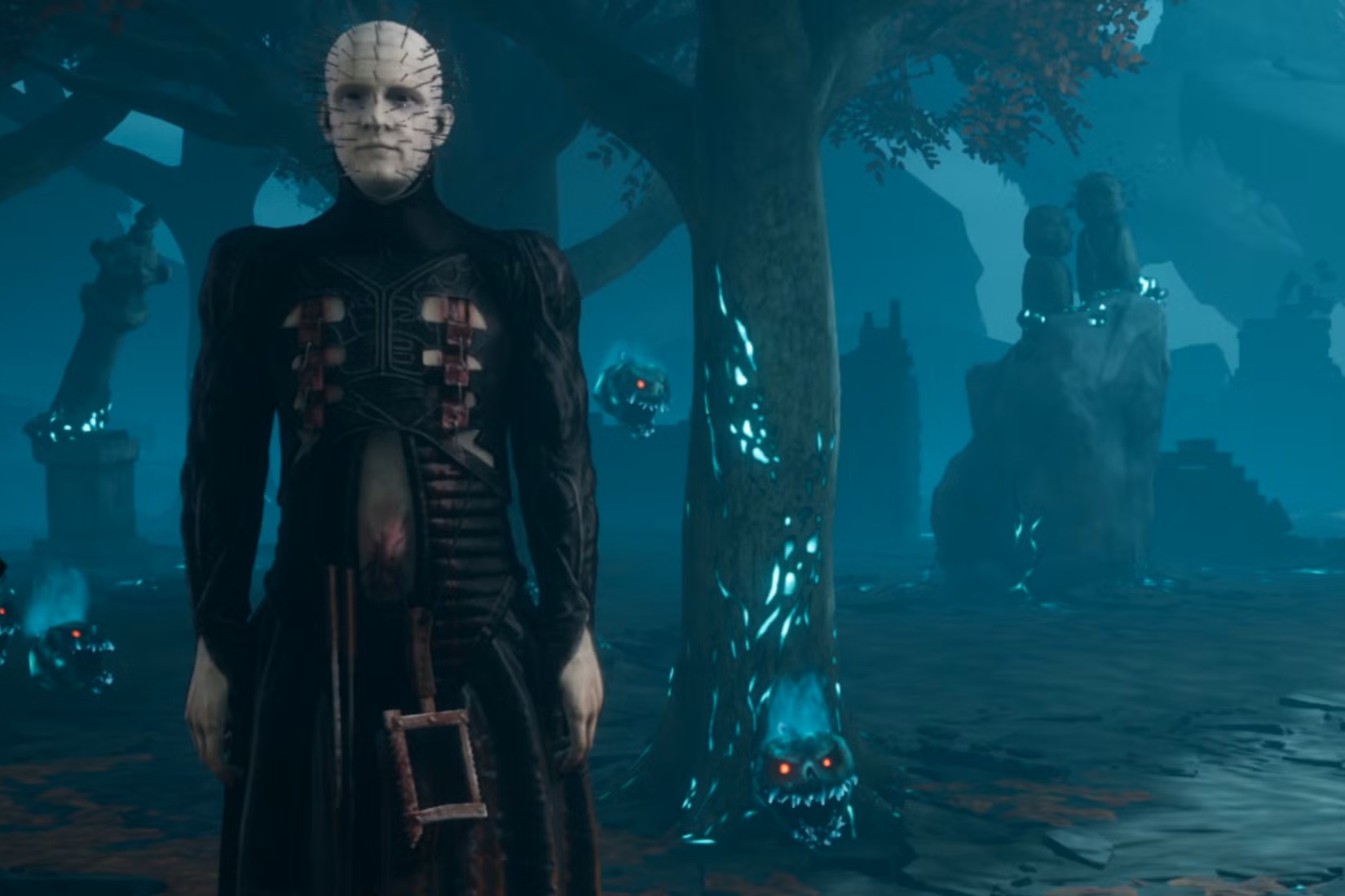 Pinhead's abilities in "Dead by Daylight" include summoning chains to trap and injure survivors, reflecting his sadistic nature.