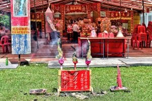 Aside from it just being rude, there could be spirits feasting underneath the altar as devotees and priests send prayers. It would definitely annoy you if someone disturbed you while eating. It’s the same for the hungry ghosts.