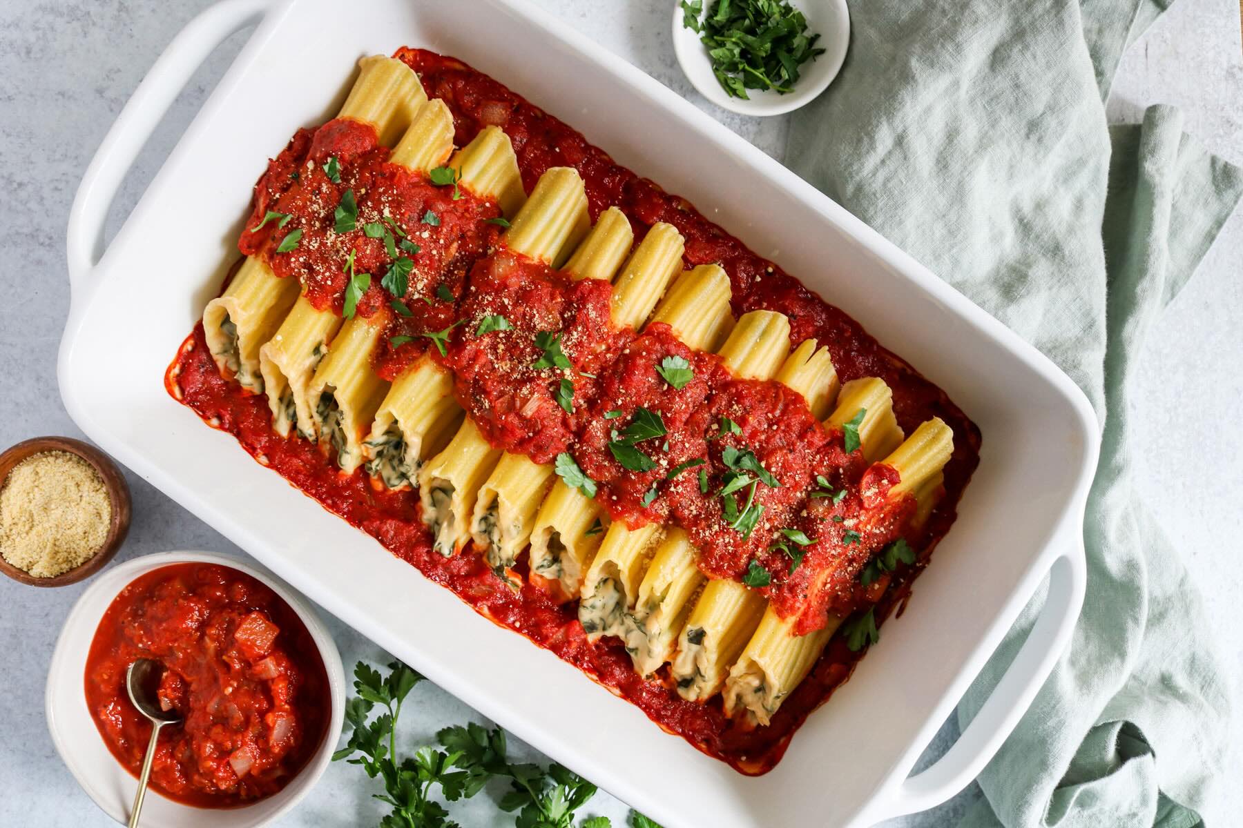 - Vegan manicotti uses plant-based ingredients. Tofu, cashew cheese, and nutritional yeast can replace traditional dairy and meat fillings.