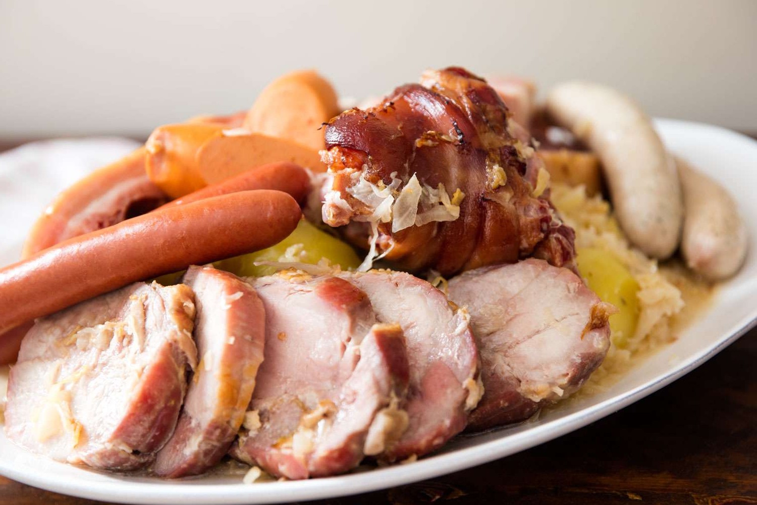 Variety of Meats: Traditional choucroute garnie includes a mix of meats such as pork, sausages, and sometimes even duck or goose.