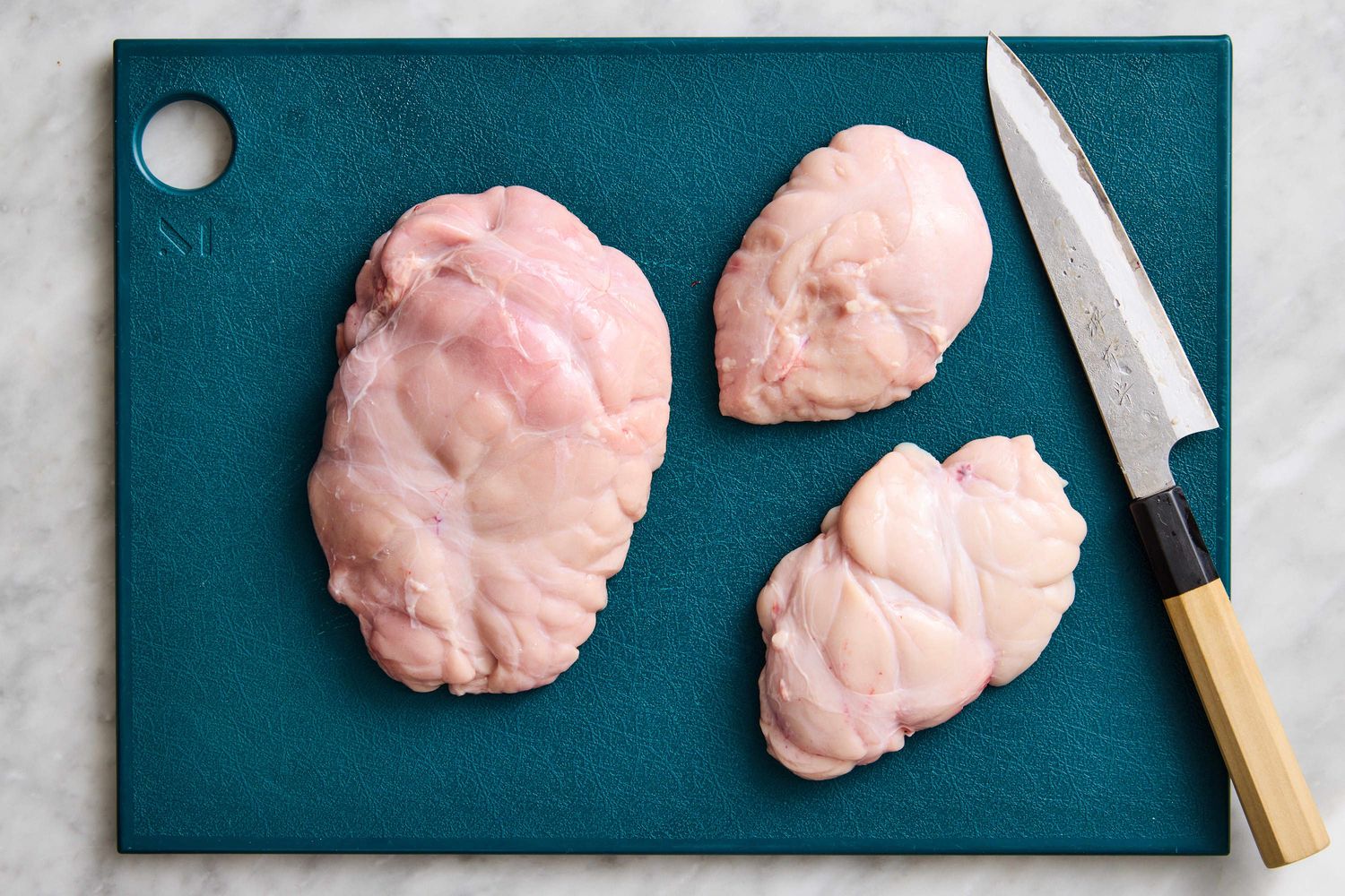 Blanching sweetbreads in boiling water for a few minutes firms up their texture and makes them easier to handle.