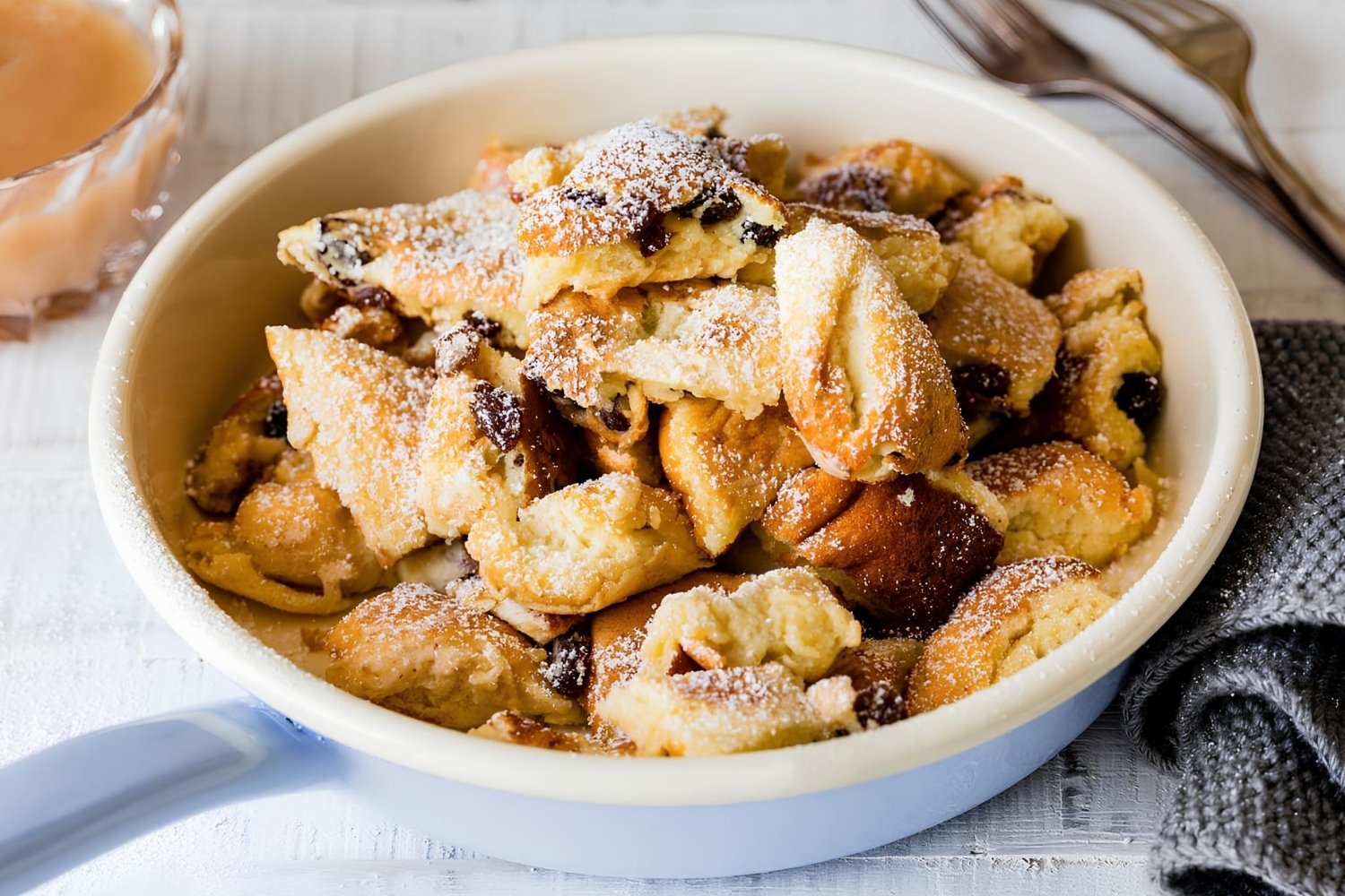 Kaiserschmarrn is usually dusted with powdered sugar and served with fruit compotes, such as apple or plum.
