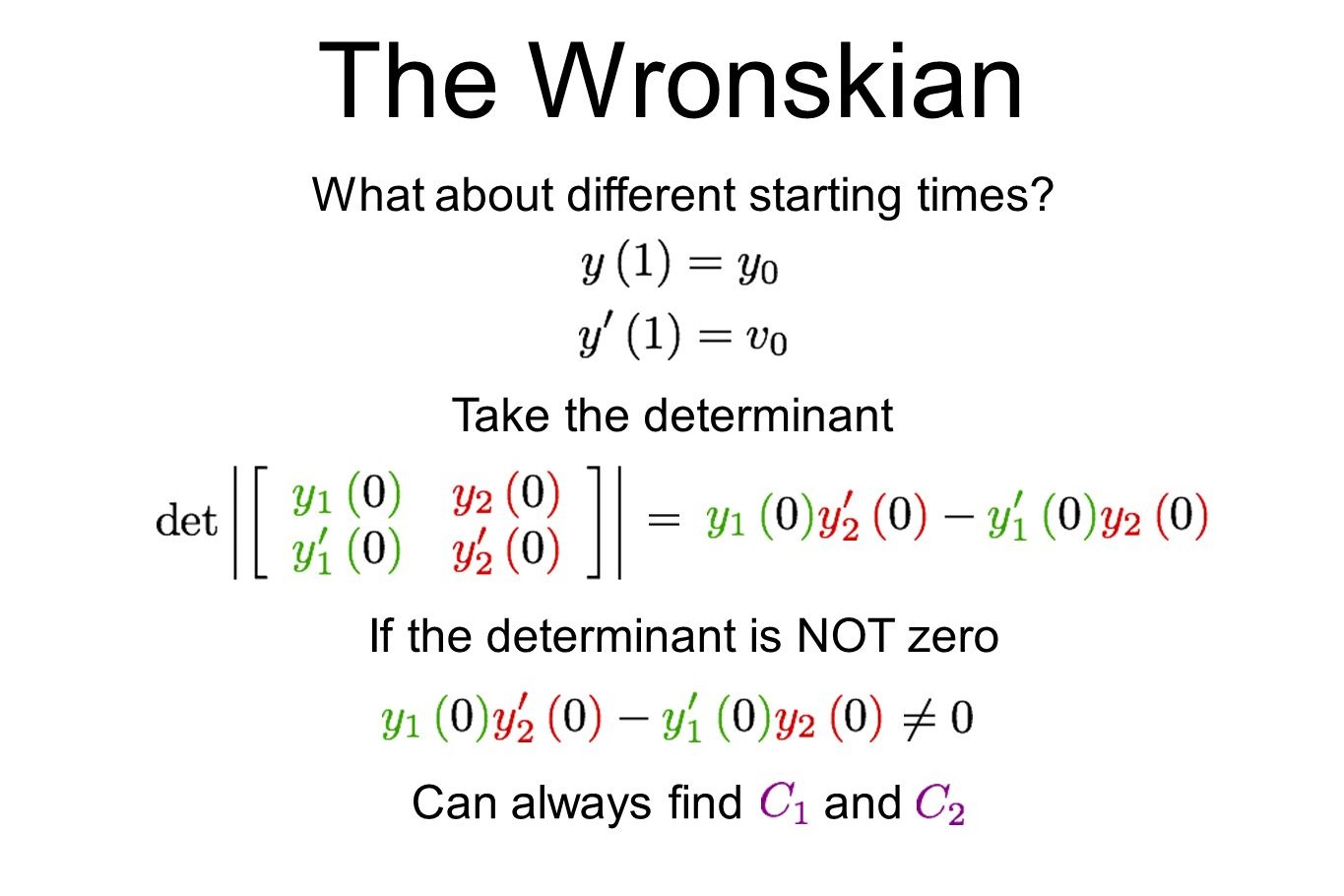 - The Wronskian is a determinant of a matrix constructed from functions and their derivatives.