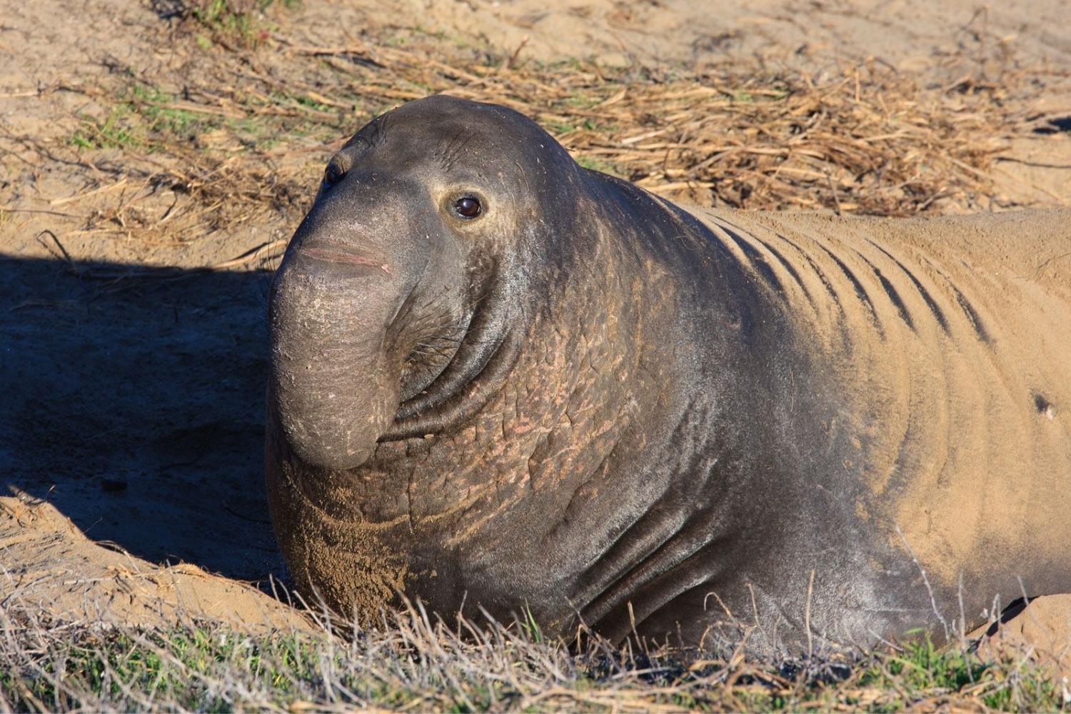 Elephant seals are named for their large size and the males' trunk-like snouts, which resemble an elephant's trunk.