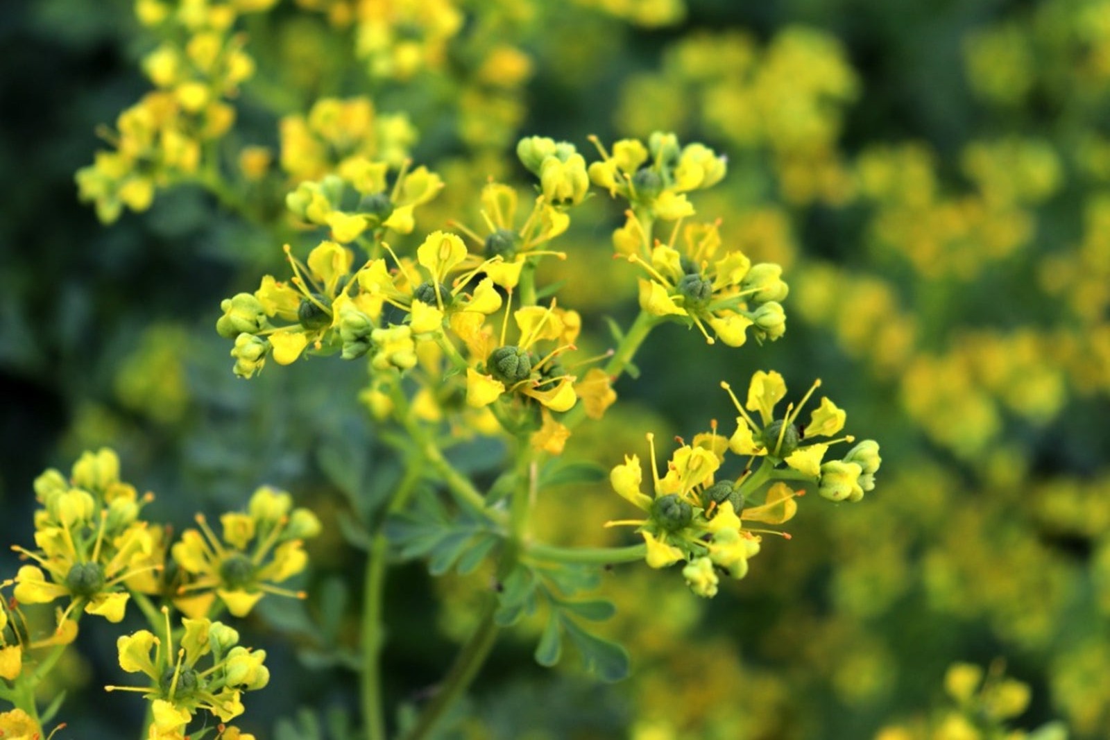 Rue has small, yellow flowers that bloom in the summer, adding a splash of color to gardens.