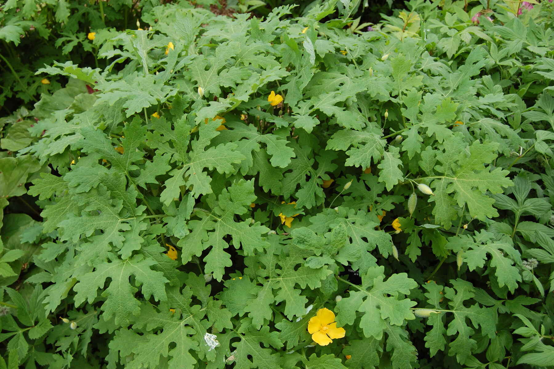 The plant's leaves are deeply lobed and have a distinctive blue-green hue, making them easily recognizable.