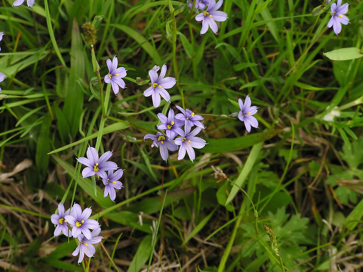 Sisyrinchium, commonly known as blue-eyed grass, is a genus of flowering plants in the iris family. Despite its name, it isn't a true grass. These plants are known for their delicate, star-shaped flowers and grass-like leaves.