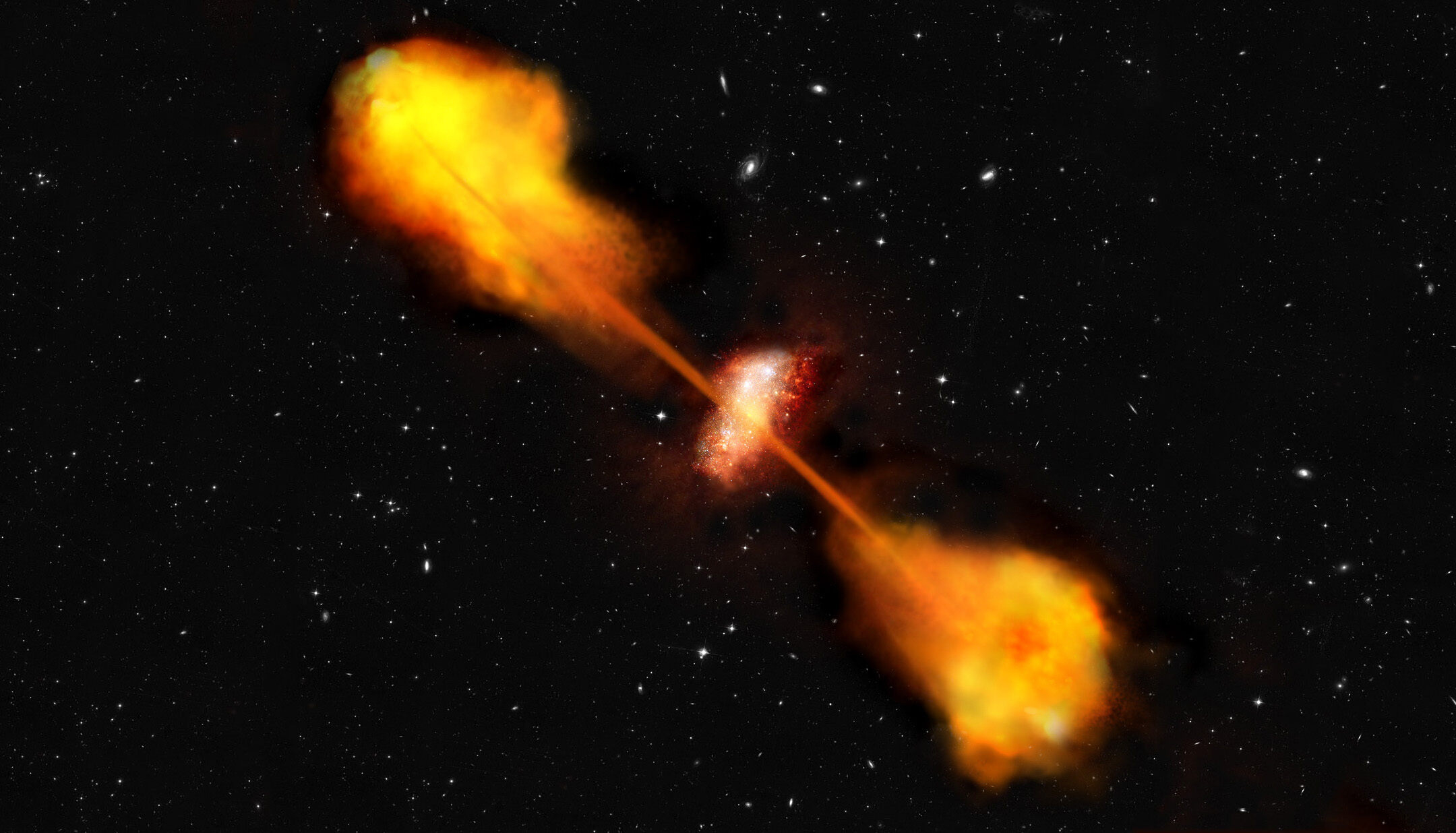 Jet Activity: The black hole ejects jets of charged particles at nearly the speed of light, creating the radio lobes.